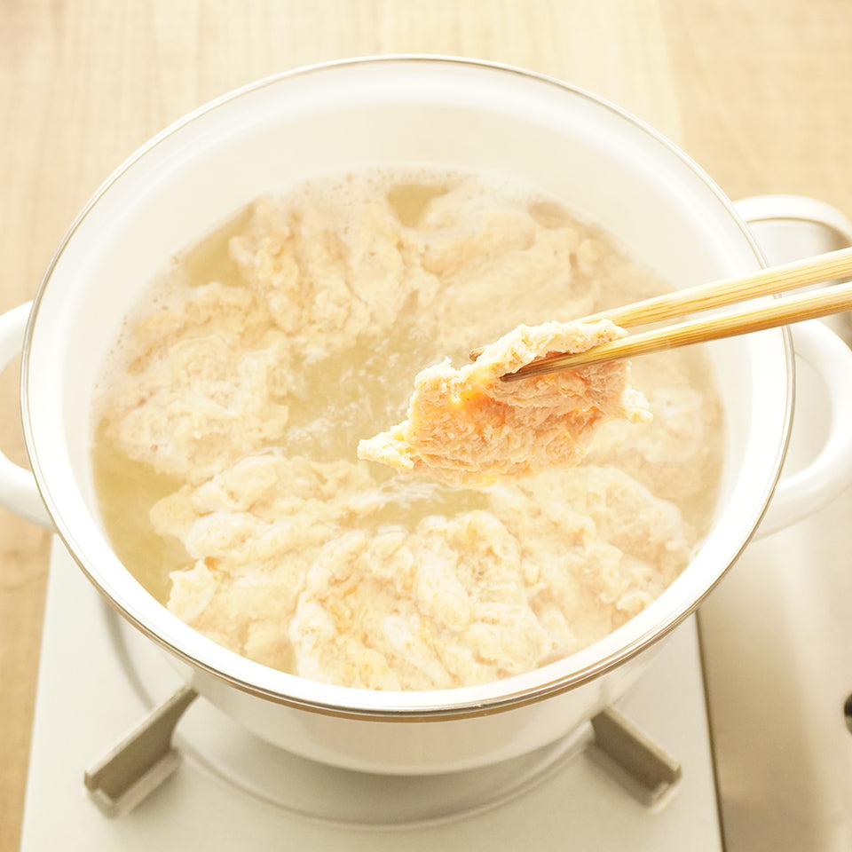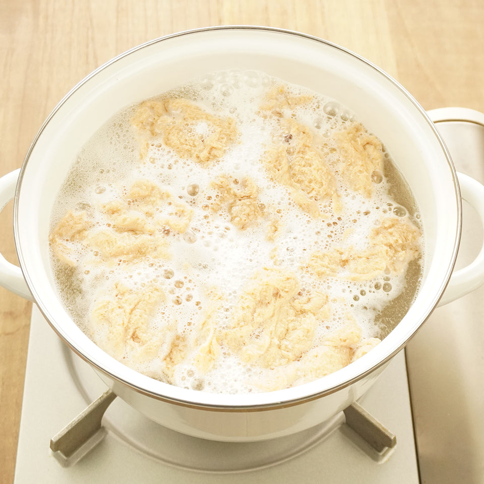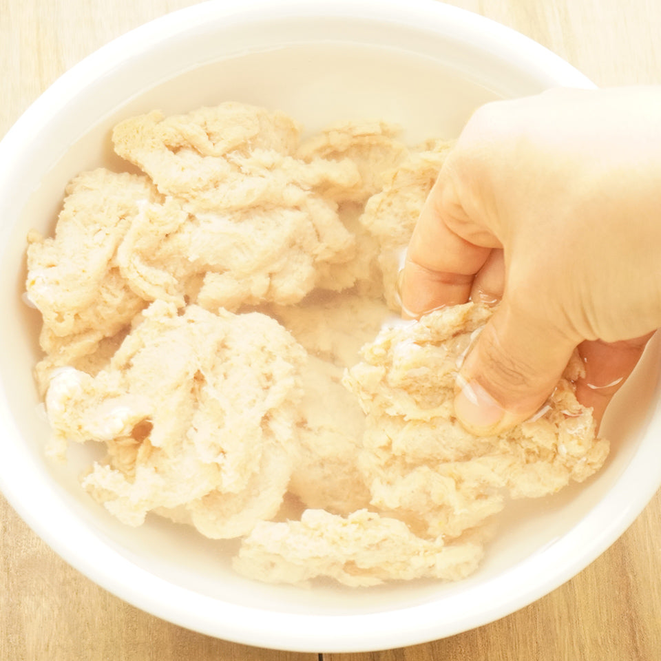 水の中で優しく揉み洗いし、水気をしっかりと絞ります。(大豆の匂いが気になる場合は、繰り返し水を換えて洗うと軽減されていきます。)